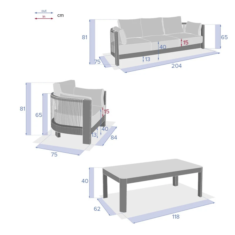 Très résistant, ce salon dispose d’une structure en aluminium traité époxy antirouille. Les coussins d’assise en oléfine (230 g/m²) sont conçus pour résister à la décoloration et aux pluies fines. Ils sont déhoussables pour un entretien facile. Enfin, les cordes sont en acrylique et le plateau en résine plastique.
